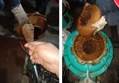 12月18日下午,陽光尚品站內(nèi)發(fā)現(xiàn)45KW循環(huán)泵運(yùn)行有卡頓,出現(xiàn)異響。設(shè)備部和生產(chǎn)部以及檢修到現(xiàn)場(chǎng)檢查,需要拆泵檢查。拆解之后發(fā)現(xiàn)軸承損壞,于是換了2個(gè)軸承。在檢查水泵葉輪的時(shí)候在葉輪內(nèi)部發(fā)現(xiàn)兩片除污器濾網(wǎng)碎片,摘除之后重新安裝,電工接線測(cè)試時(shí)已無異常情況,設(shè)備維修完成,恢復(fù)正常。
