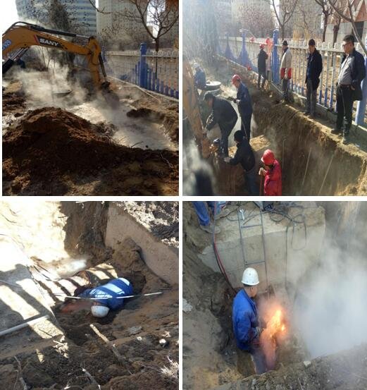 本月11日,檢修在巡檢過(guò)程中發(fā)現(xiàn)新光東路與稀土路交叉口西50米處一次網(wǎng)DN400管線有跑水現(xiàn)象。公司立即做出指示,檢修、生產(chǎn)、安全設(shè)備部等部門(mén)第一時(shí)間趕赴現(xiàn)場(chǎng)展開(kāi)搶修工作。此次漏水點(diǎn)位置位于高新一中北墻外綠化帶中,旁邊的綠植給機(jī)械挖掘工作帶來(lái)一定影響,挖出管道后隨即確定跑水點(diǎn)正處于管道正方,而且管道下方還有水泥基座,電焊人員根本無(wú)作業(yè)角度。并且漏點(diǎn)兩端閥門(mén)無(wú)法關(guān)嚴(yán),水泄不完,更是給搶修工作增加了很大的難度。由于本組管線年代較為久遠(yuǎn),氧化腐蝕比較嚴(yán)重,最后在劉總、胡總及各部長(zhǎng)研究后,由于切斷管路后不影響正常供熱,決定暫時(shí)斷管上盲板處理。同時(shí)做出夏季技改計(jì)劃,待停暖后開(kāi)始實(shí)施。