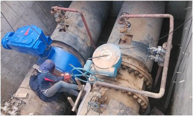 7月8日,我公司外網(wǎng)技術(shù)改造項目進行至沼園南路與民族東路路口西側(cè)100米處E15#井更換DN1200蝶閥一個。由于以前閥門無法起到截斷作用,今年計劃更換進口閥門。進口閥門為焊接閥門,經(jīng)過工程隊連續(xù)作業(yè),動用吊車、鏟車、貨車等相關(guān)工程器械車輛,用時一周時間順利更換完畢。考慮到新閥門手輪太大及井下空間有限,施工隊將手輪重新焊接到合適尺寸并安裝,各部門已驗收合格。