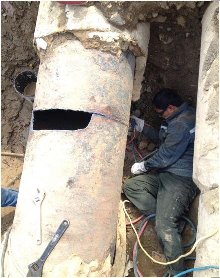 經(jīng)過挖掘機的處理后發(fā)現(xiàn)是由于黃河大街前年施工時將我公司管道保溫層破壞后,幾年腐蝕出現(xiàn)漏點。經(jīng)過幾天的緊急搶修,破損管路已處理完畢并將裸露部分進行了保溫填充。