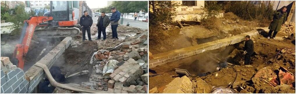 10月14日,鹿港站報(bào)告:鹿港小區(qū)西門北100米二次管網(wǎng)泄漏。此次泄漏二次管網(wǎng)不屬于我公司管轄范圍,但由于管理此管線的所屬物業(yè)已撤走,經(jīng)過公司與政府主管部門協(xié)商,此次事故搶修任務(wù)由我公司進(jìn)行處理。接到任務(wù)后搶修小組立即調(diào)派挖機(jī)及人員對現(xiàn)場開始搶修。當(dāng)天對跑水的故障管線更換完畢,并對已經(jīng)破壞的管路保溫重新包裹,確保此次搶修任務(wù)不留隱患,保證周圍居民正常安全用熱。
