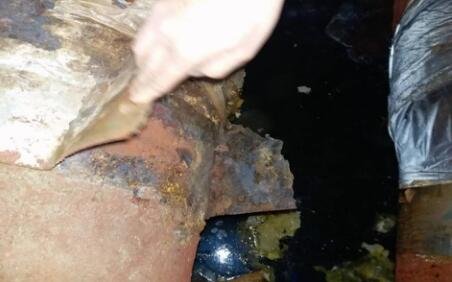5月8日,公司各主要部門對檢修完成的熱力站進行了驗收工作。檢修對運行車間上報的維修內(nèi)容全部完成。往年遺留的基建問題仍無法處理。共驗收5個熱力站其中景富A、古城、景富C房頂漏水、地坑無蓋板,永茂泉地基下沉嚴重。驗收結束對M7井進行查看,發(fā)現(xiàn)井下套筒補償器內(nèi)襯不銹鋼皮破損嚴重,管路腐蝕嚴重。如下圖