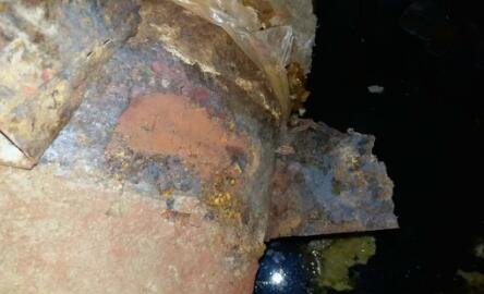 5、下圖高油房南門M7井內(nèi)補償器腐蝕嚴(yán)重,不銹鋼鐵皮內(nèi)襯撕裂損壞。