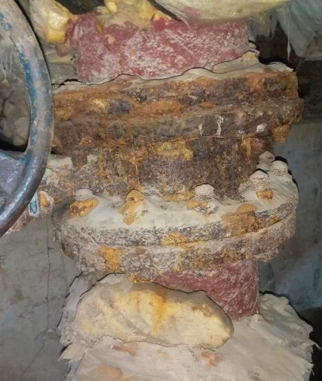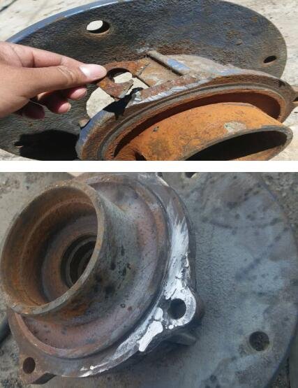 5月初,檢修A組在日月豪庭熱力站檢修的時候發(fā)現(xiàn)站內(nèi)里屋機組循環(huán)泵電機底座出現(xiàn)裂痕。無法固定電機容易造成安全隱患。檢修人員對底座損壞處進(jìn)行了焊接,由于焊接材質(zhì)為鑄鐵,需要通過特殊鑄鐵焊條進(jìn)行焊接,難度比較大。焊接后重新安裝使用。另外站內(nèi)補水管道出現(xiàn)多處砂眼漏水,檢修重新更換其站內(nèi)部分補水管。