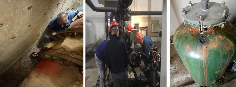 五月份,公司夏季檢修工作繼續(xù)穩(wěn)步進(jìn)行。檢修人員按計(jì)劃對(duì)公司所轄各個(gè)熱力站、熱力井進(jìn)行維護(hù)作業(yè)。右圖為和平北熱力站鹽罐出現(xiàn)砂眼,待修中。